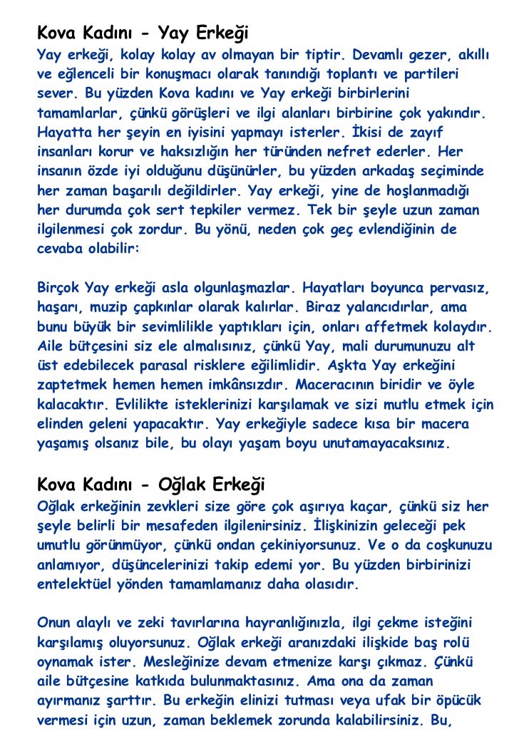 Aslan kadını ile kova erkeği evlilik uyumu. Bir kova ancak emin olduğu bir kişi ile evliliği düşünür çünkü özgür yapısı nedeniyle evliliğe pek yatkın bir burç insanı değildir. Ancak kova kadını ten uyumundan ziyade zihinsel uyuma önem verir. Kova burcu erkeği özgürlük düşkünüdür ve bu nedenle cinsel hayatlarında sürekliliğe dayanamaz sürekli farklı deneyimler peşinden gider.